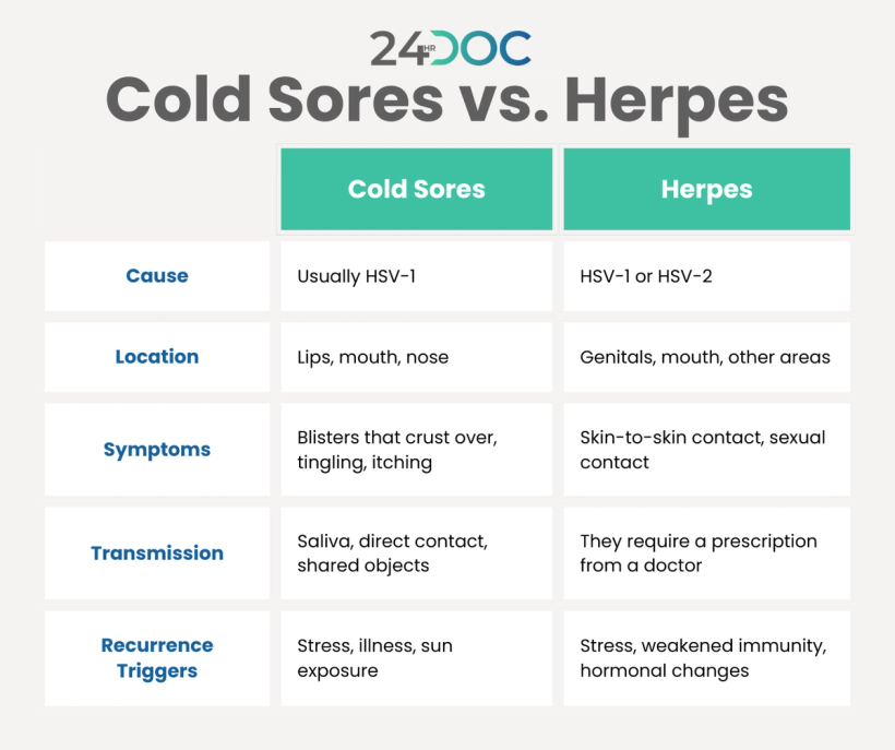 Transmission methods vary slightly, with cold sores spreading through saliva, direct contact, and shared objects, while herpes is primarily spread through skin-to-skin and sexual contact.⁴